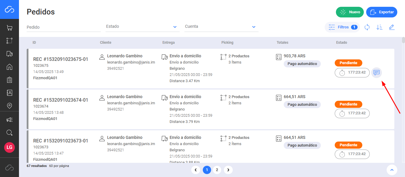 Este destaque también se puede ver en el listado de pedidos, ayudando a los usuarios a identificar rápidamente las órdenes críticas. Además, se podrá filtrar el listado de pedidos para visualizar únicamente aquellos que tengan mensajes destacados activos, facilitando la gestión priorizada de la operación.