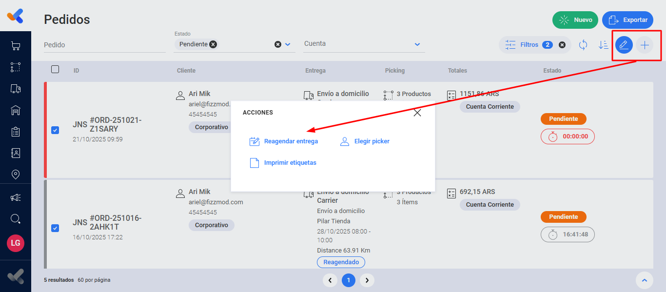 Para realizar un reagendamiento masivo se deben primero seleccionar los pedidos sobre los que se quiere realizar una acción y luego seleccionar la opcón de "Reagendar entrega".