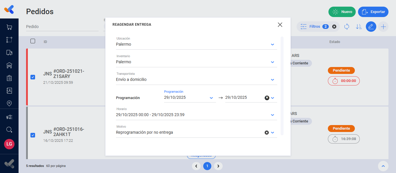 Esta funcionalidad permite reagendar el envío de los pedidos que así lo requieran.