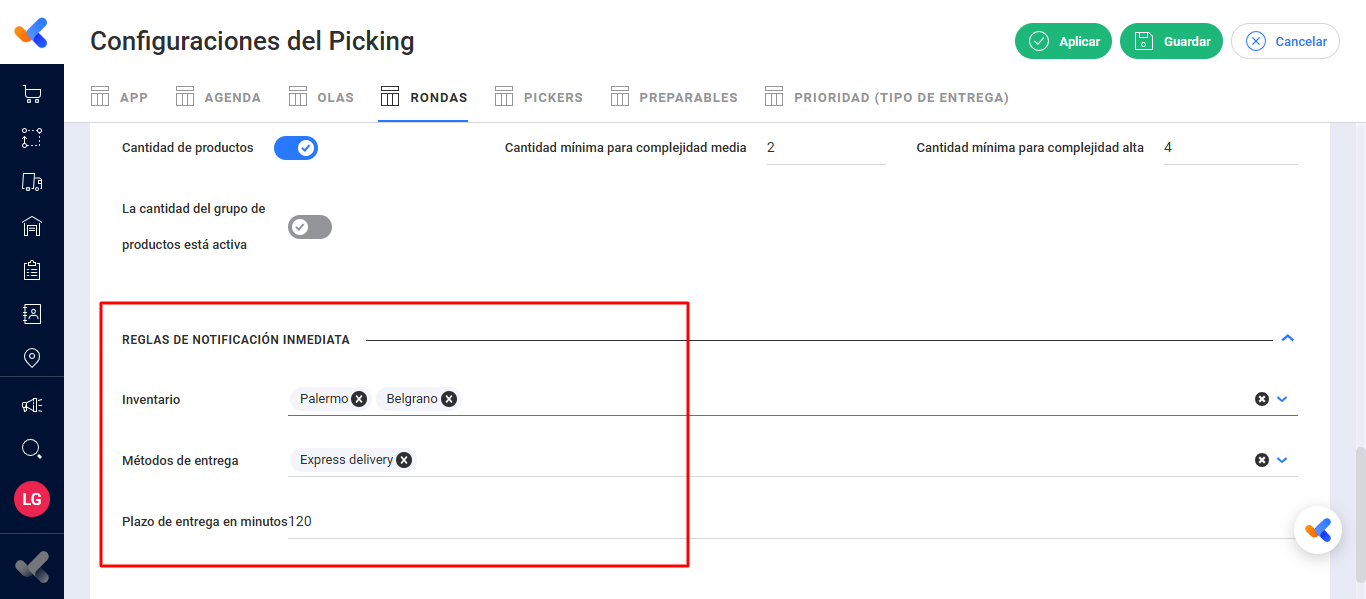 Para que las notificaciones de órdenes prioritarias operen correctamente, se deben establecer parámetros específicos dentro de las configuraciones de Rondas, en la sección de "Reglas de notificación inmediata".