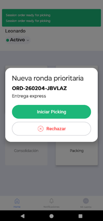 - Aceptar: El sistema detiene el sonido, asigna la sesión de picking automáticamente y dirige al usuario a la pantalla de trabajo para iniciar la preparación.