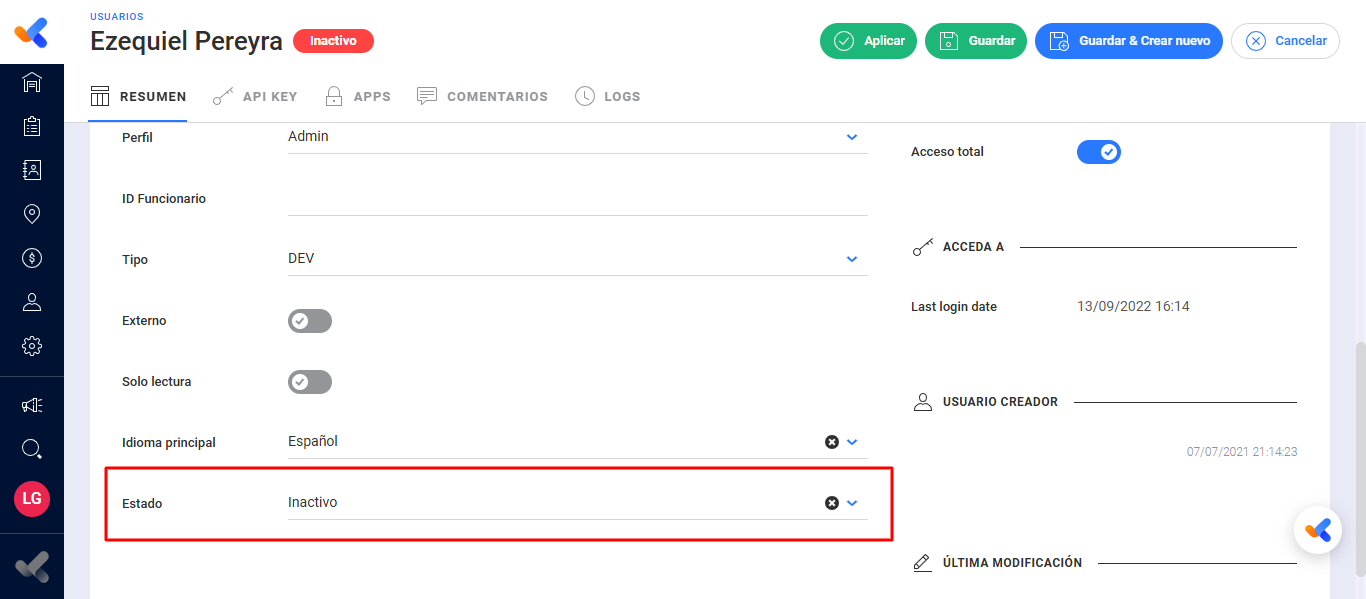 En caso tener un usuario activo y querer inactivarlo, solamente se deberá modificarle el estado a "Inactivo" y seleccionar la opción de "Aplicar".