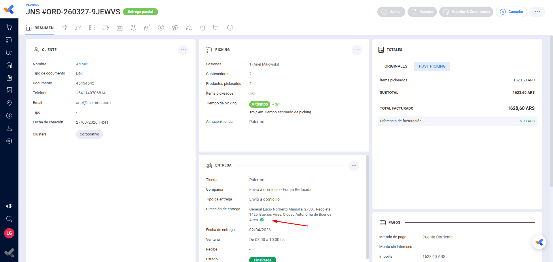 A nivel de Pedido y Entregas, se muestra un icono verde de verificado junto a la dirección de entrega tanto en la vista de detalle como en el mapa de rutas y en el módulo de Delivery.