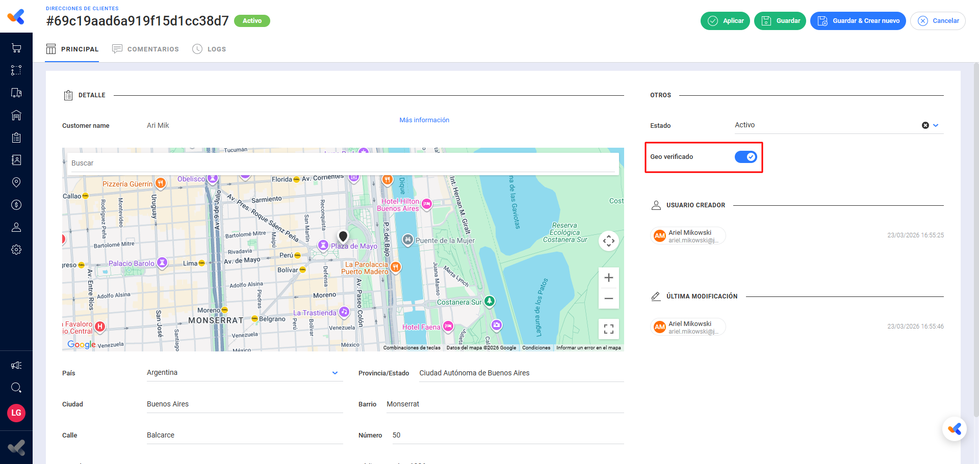 De forma manual, el usuario puede marcar una dirección como verificada o ingresar coordenadas correctas mediante el formulario de edición de la dirección, siempre que cuente con los permisos necesarios.